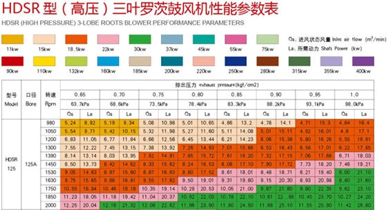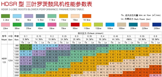 上圖為高壓125三葉羅茨風(fēng)機型號參數(shù)