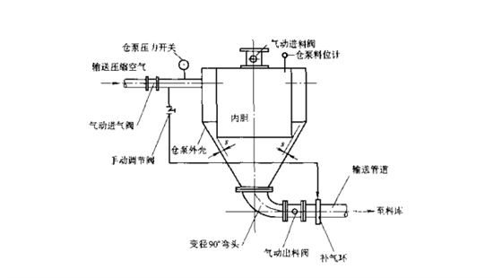 1、當L型倉泵裝料到高料位時,倉泵料位計發(fā)出輸送信號,關閉氣動進料閥,開啟倉泵氣動進氣閥。輸送用壓縮空氣被輸入倉泵外殼與內膽之間,然后通過倉泵外殼錐體部位于內膽之間的S型間隙向下噴吹,輸送壓縮空氣通過此間隙的流速在20m/s左右,此時一方面使干灰在倉泵錐體部分得到流化,另一方面?zhèn)}泵內壓力迅速提高,當倉泵內壓力達到預先設定的開泵壓力時,倉泵壓力開關輸出信號,開啟起送出料閥,此時l型倉泵內物料通過變徑90°彎頭被輸送到輸送管道內進行栓狀流輸送。